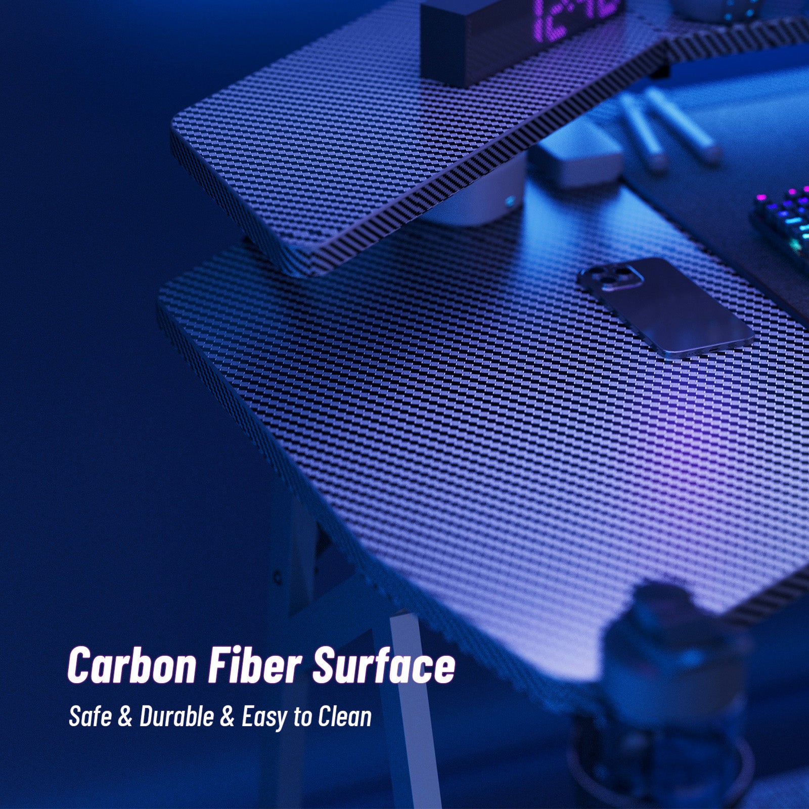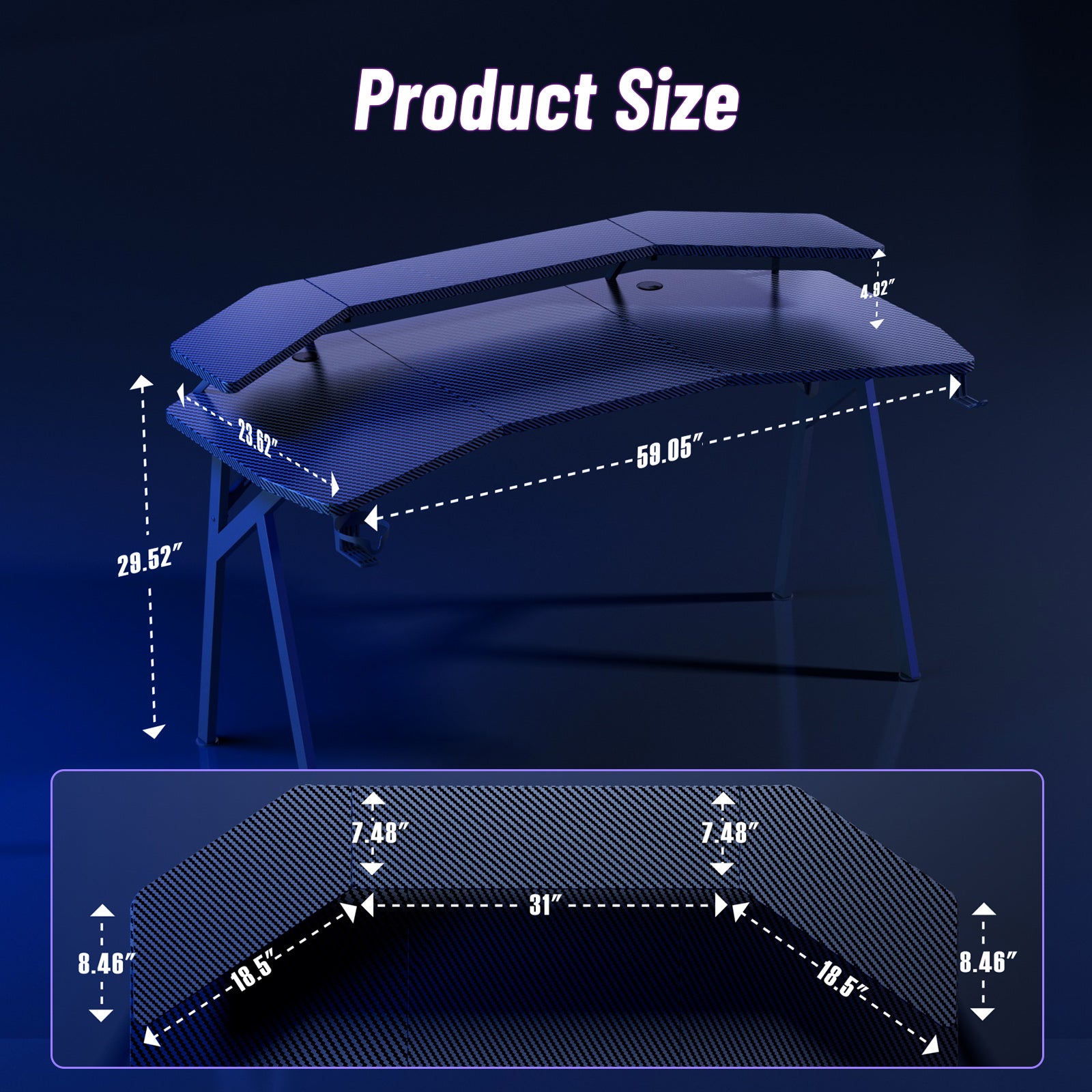Wasait 59 inch Gaming Desk K Shaped Computer Gaming Desk with Monitor Stand PC Computer Desk Carbon Fiber Workstation Gaming Table with Headphone Hook & Cup Holder for Home Office